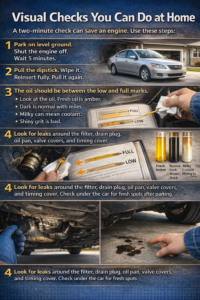 Realistic infographic showing how to check engine oil level with a dipstick, inspect oil condition (amber, dark, milky), top up oil correctly, and look for leaks under the car around the oil filter, drain plug, and oil pan.